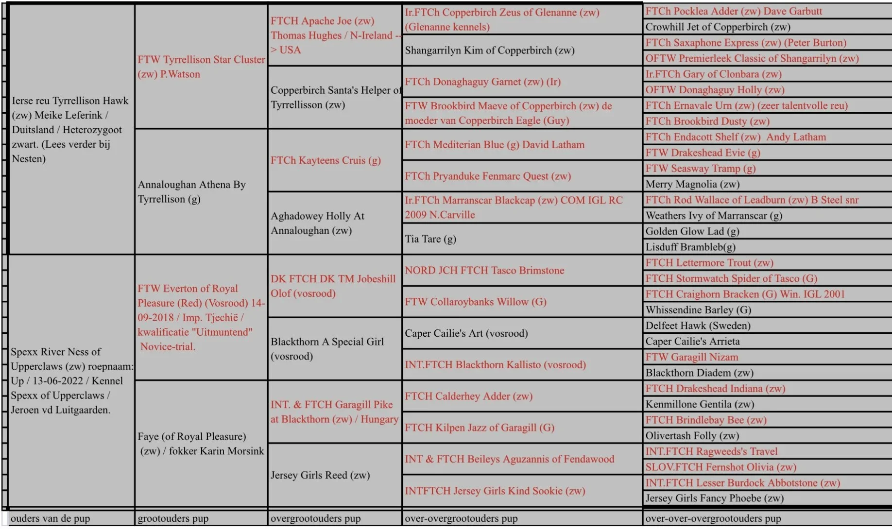 De in rood geschreven labradors zijn (veld) werkkampioen (Int.FTCh of FTCH in het land waar de wedstrijden werden gehouden ) of winnaar van een veldwedstrijd (FTW / OFTW).